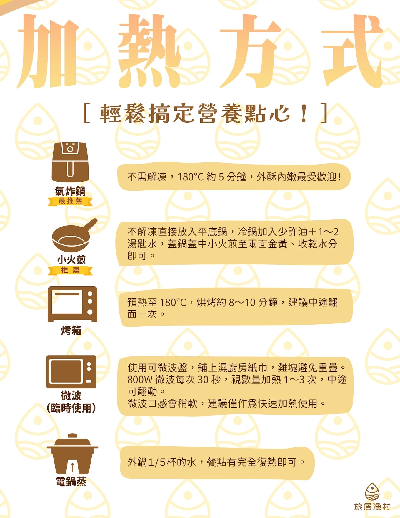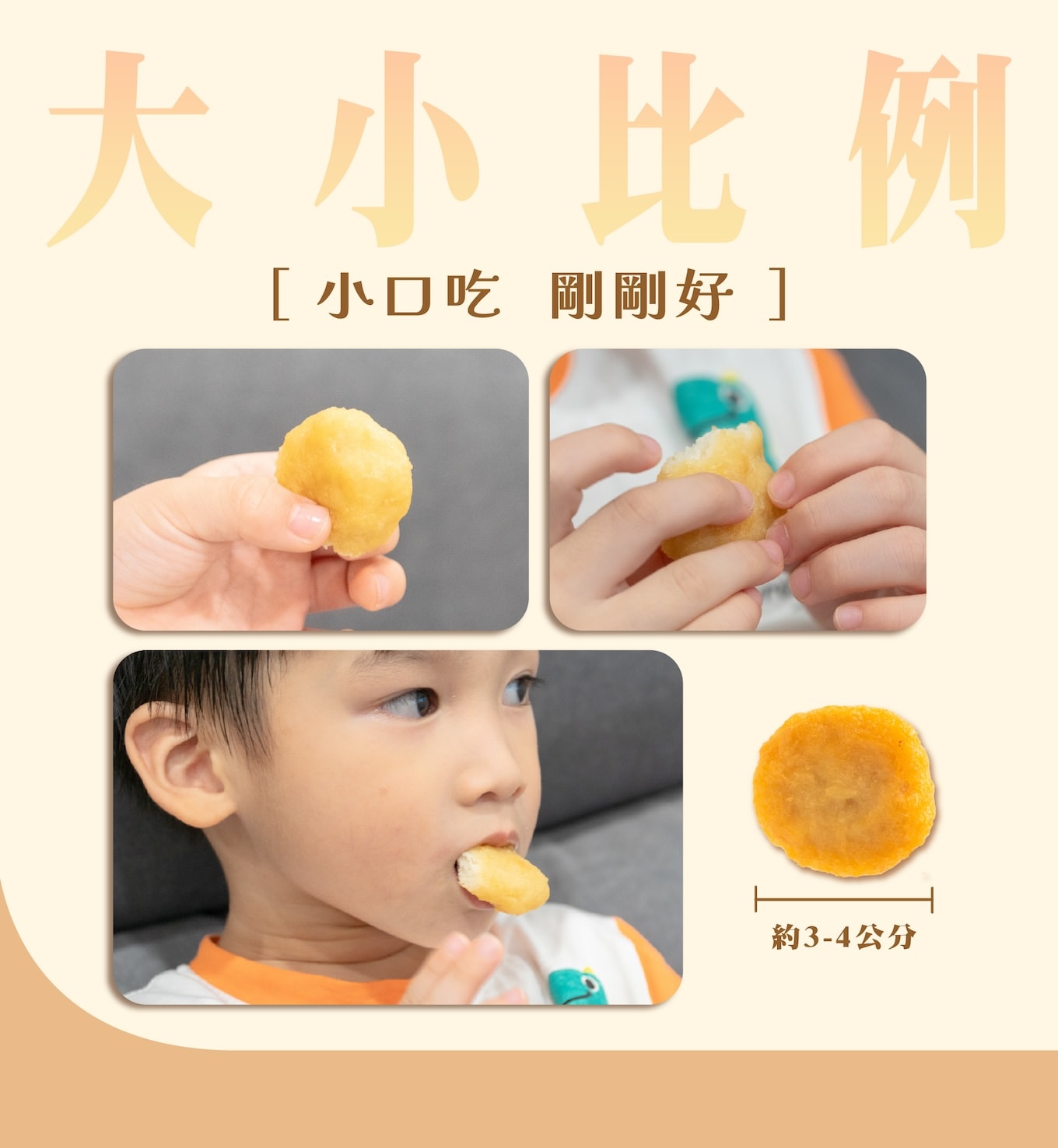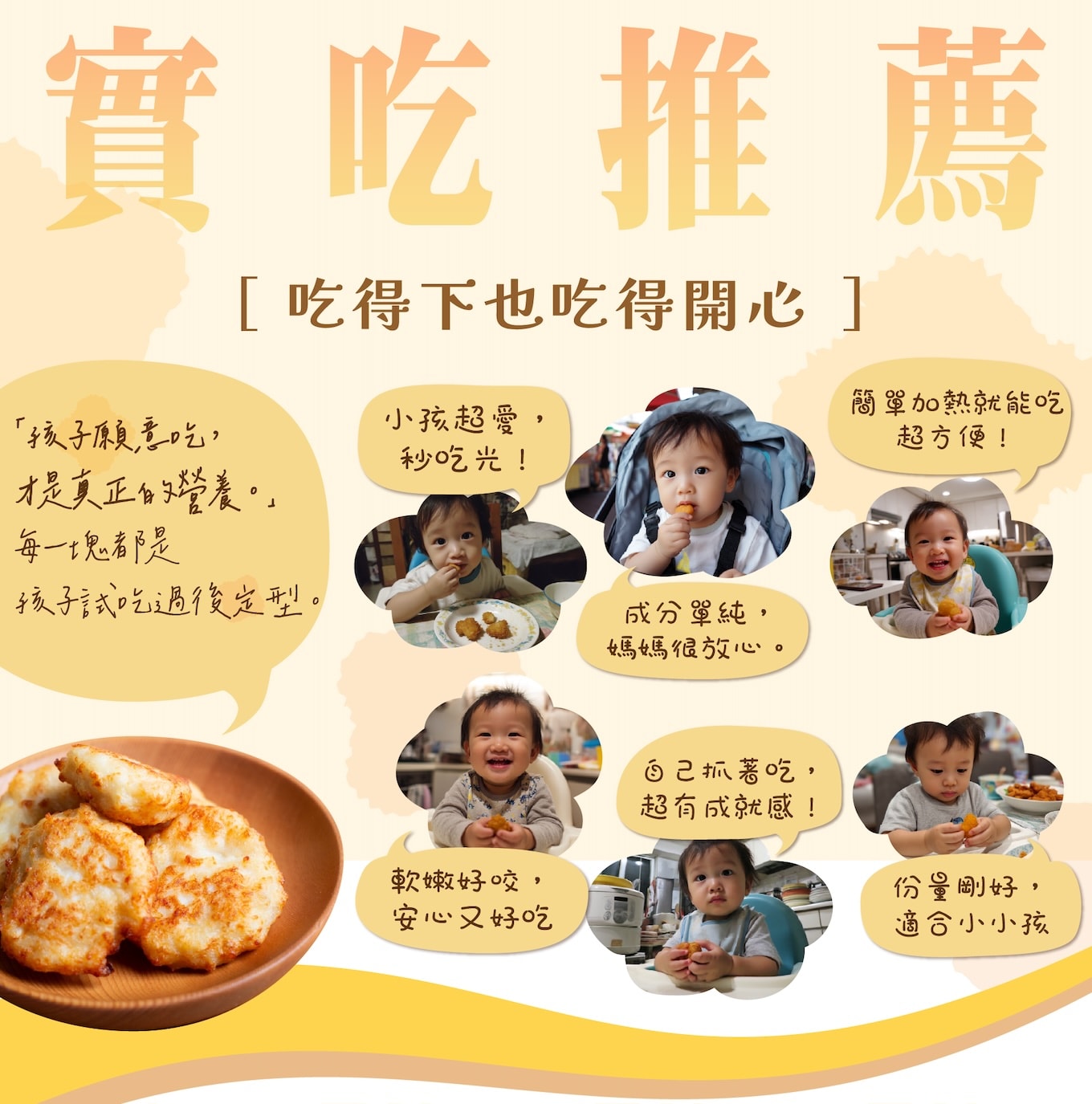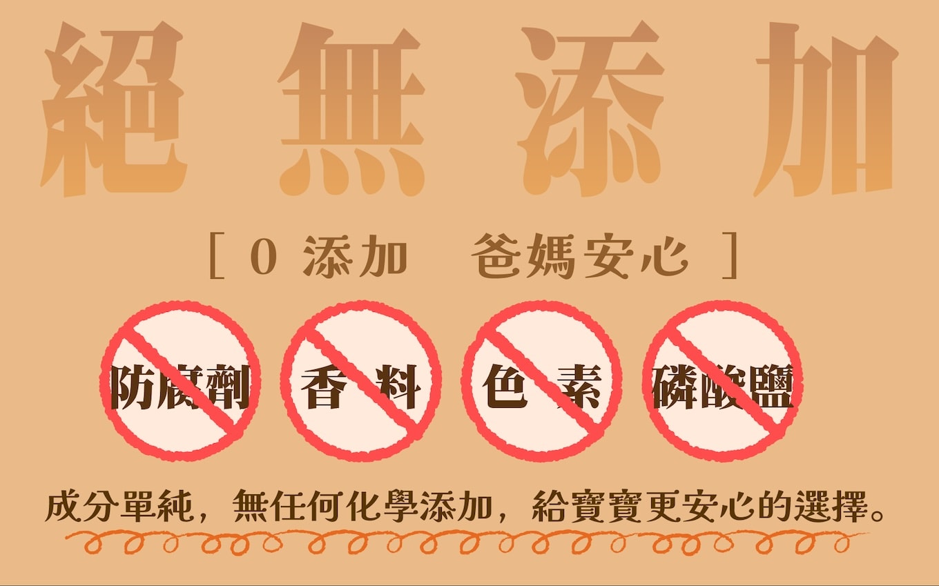 | 加熱即食 | 全熟出貨,烤箱/氣炸鍋覆熱即可 | 爸媽省時,寶寶隨時享用 |
